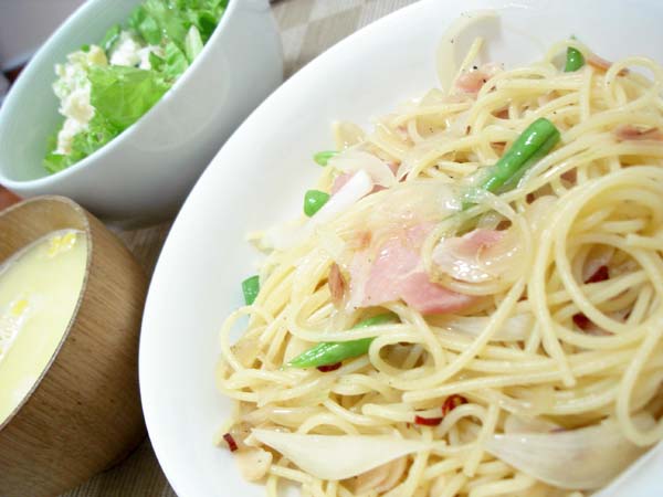 ちょっと多めのオリーブオイルで具材を炒め、パスタの茹で汁を加えたらコンソメスープの素(粒状)小さじ1を入れて少し煮詰め、茹で上がったパスタと絡めて出来上がり。